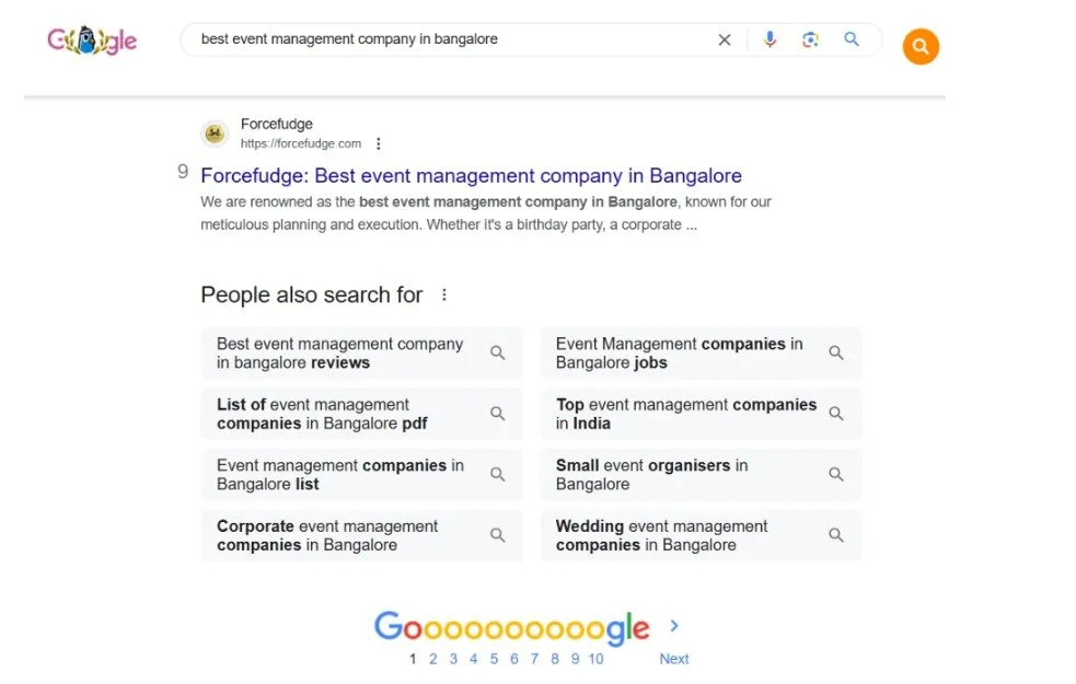 ForceFudge consistently ranked on the first page of Google search results for relevant keywords such as “Best event management company in Bangalore”.